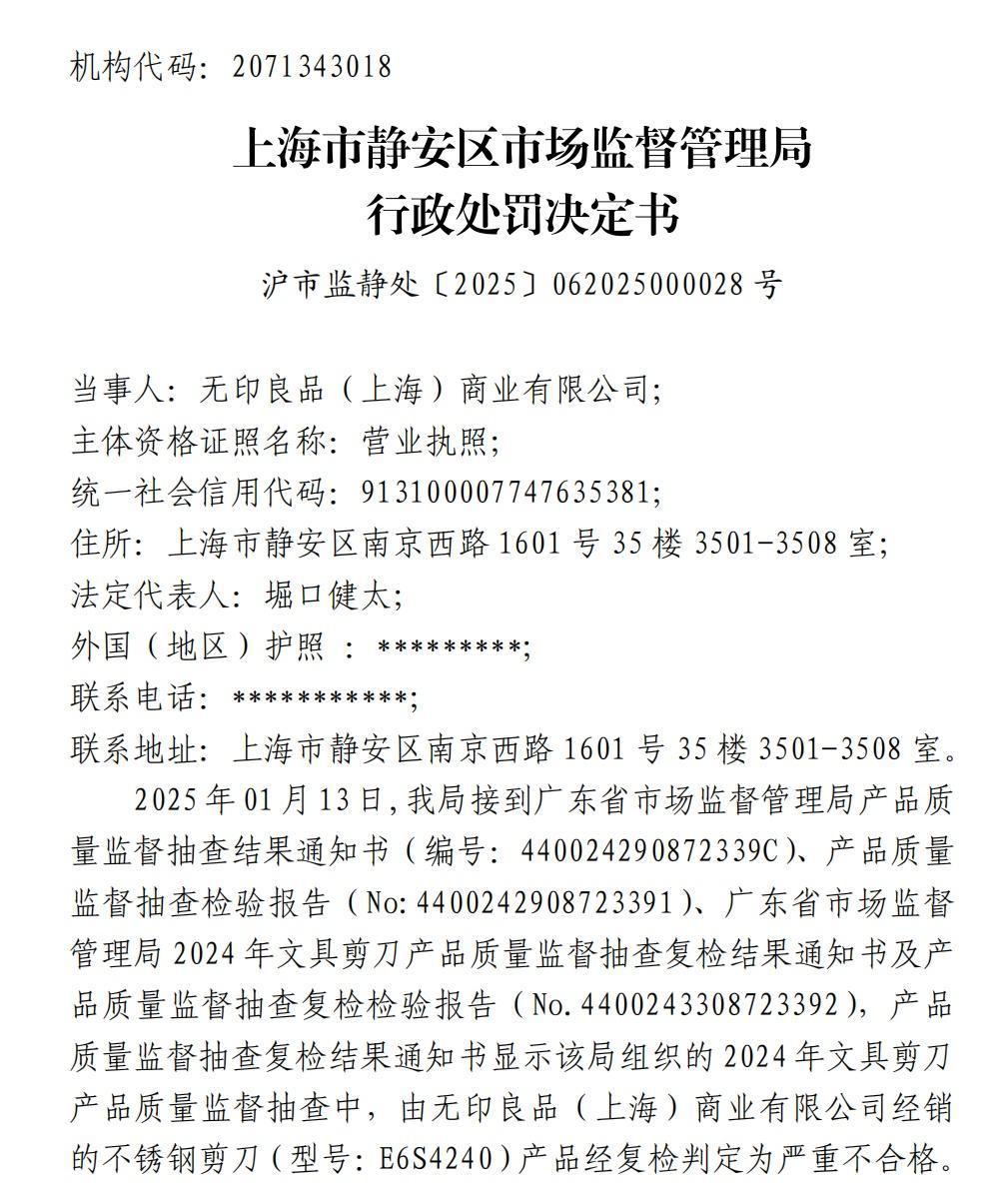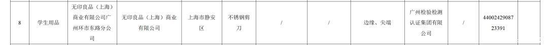 其中,1款标称由无印良品(上海)商业有限公司生产的,无印良品(上海)商业有限公司广州环市东路分公司销售的,规格型号为 E6S4240的“不锈钢剪刀”边缘、尖端项目被抽检不合格。